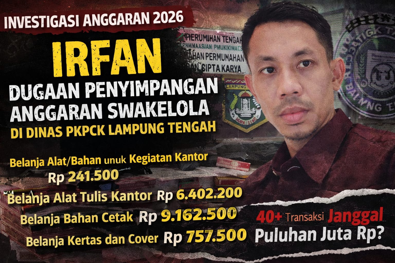 Sorotan kini mengarah pada Irfan Toga Setiawan, selaku Kepala Dinas Perumahan, Kawasan Permukiman, Pertanahan dan Cipta Karya Kabupaten Lampung Tengah, terkait dugaan penyimpangan anggaran melalui skema swakelola Tahun Anggaran 2026.