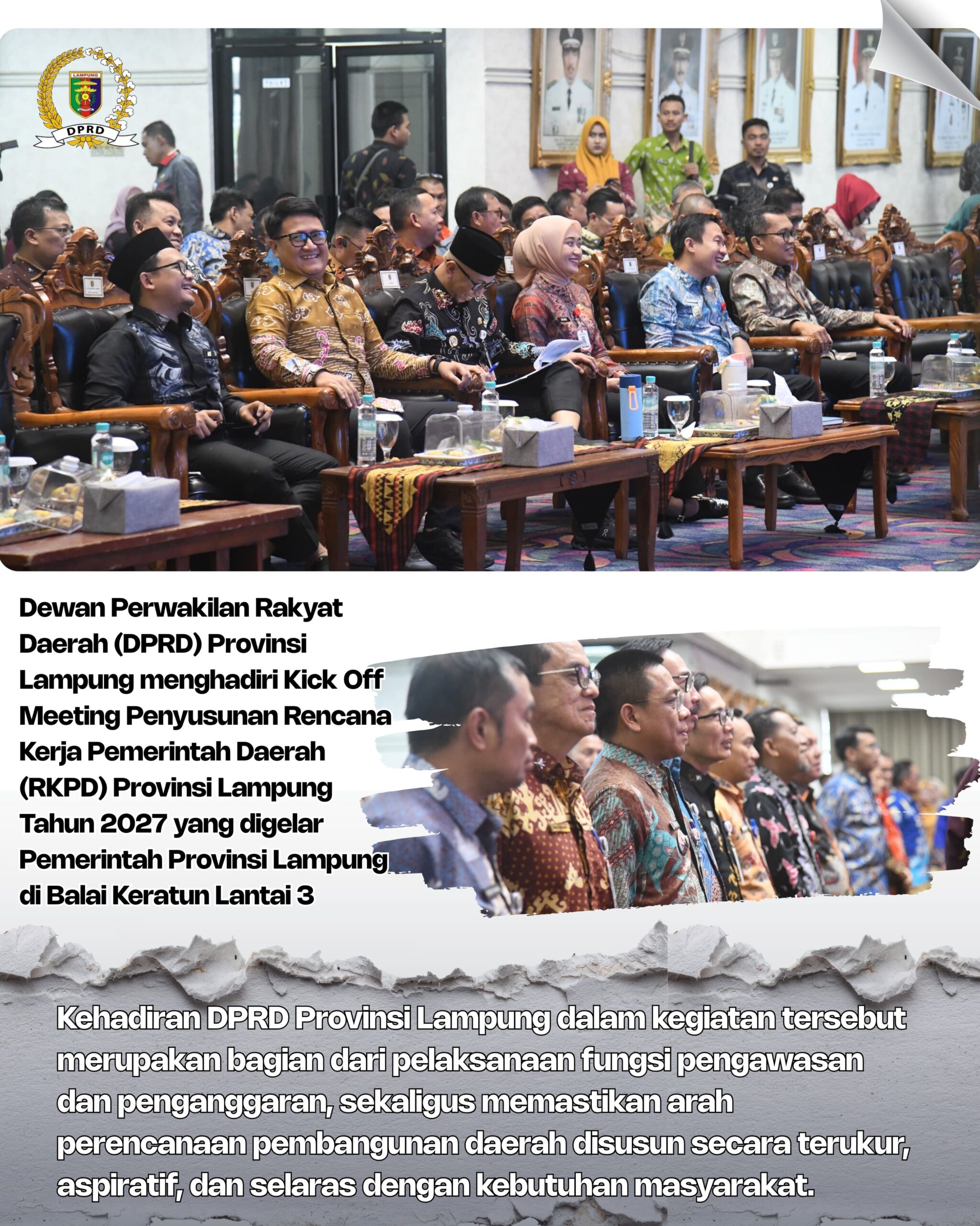 Bandar Lampung — Dewan Perwakilan Rakyat Daerah (DPRD) Provinsi Lampung menghadiri Kick Off Meeting Penyusunan Rencana Kerja Pemerintah Daerah (RKPD) Provinsi Lampung Tahun 2027 yang digelar Pemerintah Provinsi Lampung di Balai Keratun Lantai 3, Komplek Perkantoran Pemerintah Provinsi Lampung, Kamis (15/1/2026).